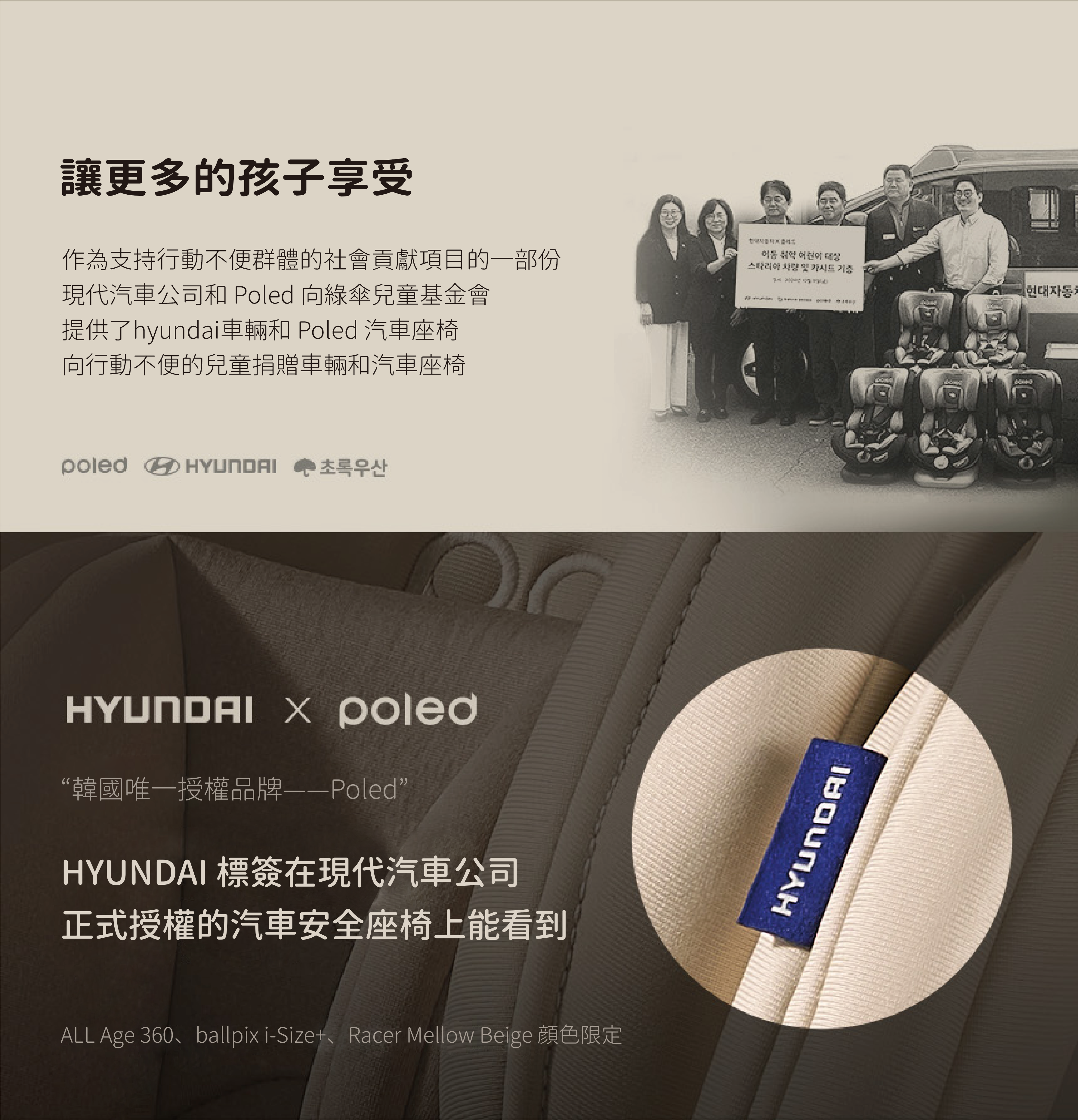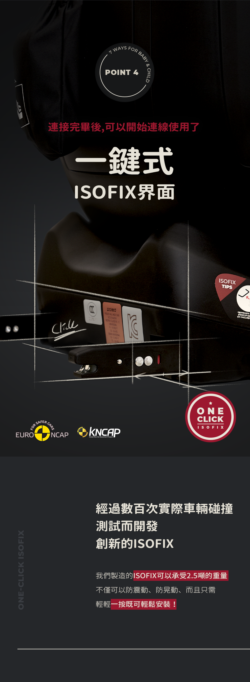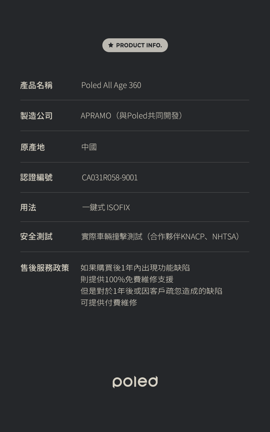 這款Hyundai正式授權的汽車安全座椅是唯一經過真車碰撞測試的產品。POLED汽車座椅由專業研究人員針對碰撞、傷害和人體工學進行設計,具備一鍵式ISOFIX安裝系統和i-size尺寸測試。座椅配有鎖緊帶、低重心回彈限位器,以及四重防護的側面碰撞吸收系統,並設有安全帶鬆開警報,增強安全性。