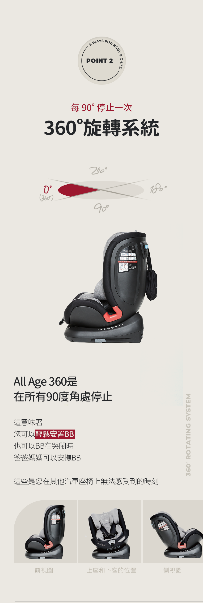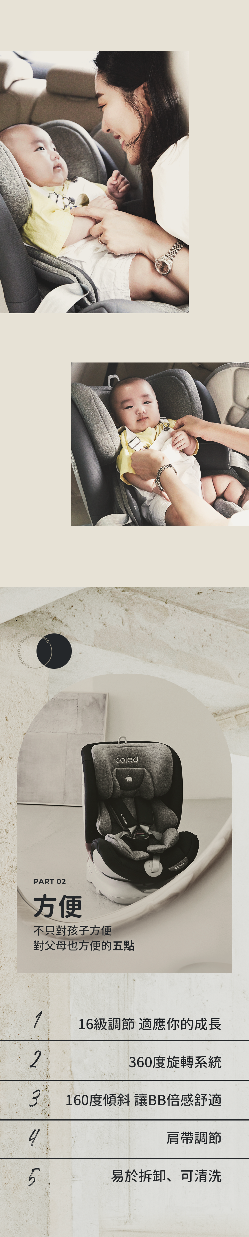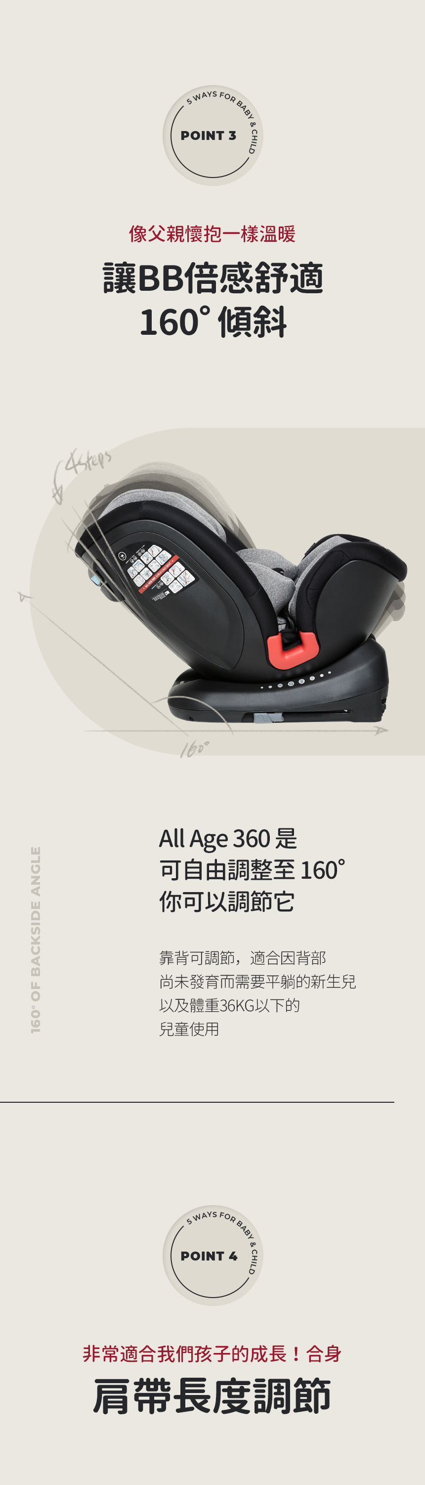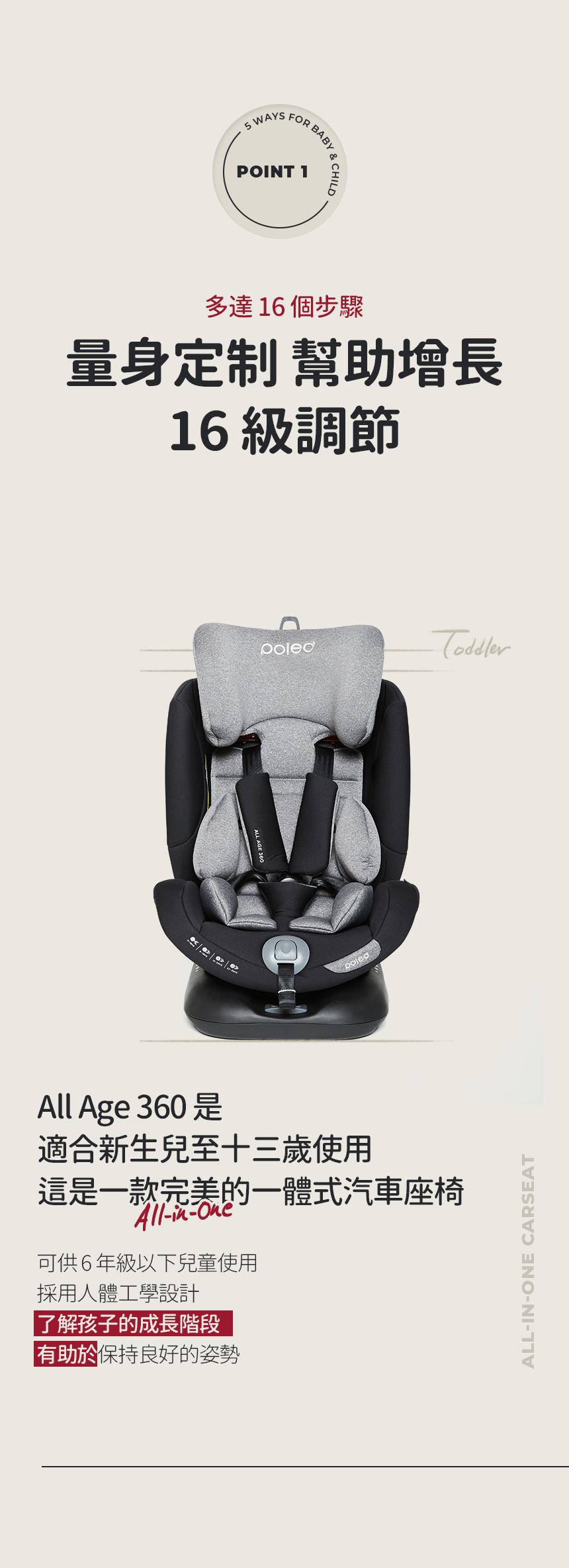 此外,座椅的傾斜角度可達160度,讓寶寶倍感舒適,並可根據成長需求進行16級高度調節,適用於從新生兒到13歲的孩子。該座椅通過67項安全測試,並使用健康材料製造,不含甲醛、汞和鉛等有害元素,為您的孩子提供安全舒適的乘坐體驗。