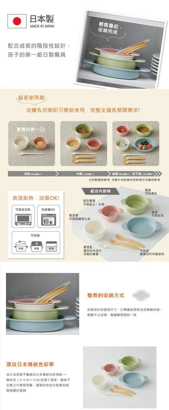 - The tableware has a heat resistance of 140°C, can be steam sterilized and microwaved, and does not contain BPA.