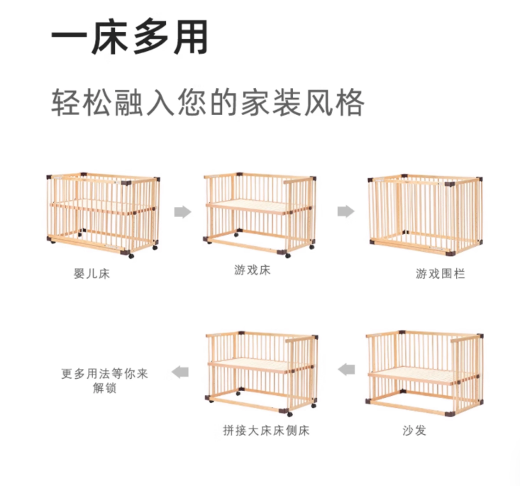 功能:嬰兒床、床側床、遊戲圍欄、沙發