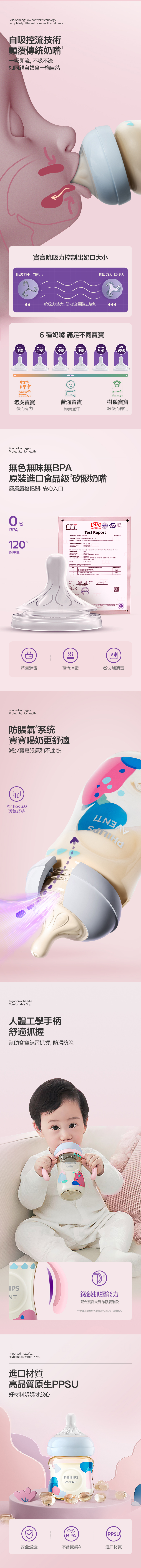 每個寶寶的餵哺方式都各有不同,而且都有自己的發展步調。因此,我們設計了一系列流速,以便您可以找到最適合寶寶的流速,讓奶瓶更切合個人需要。所有自然吮吸奶嘴均由柔軟的矽膠製成。
