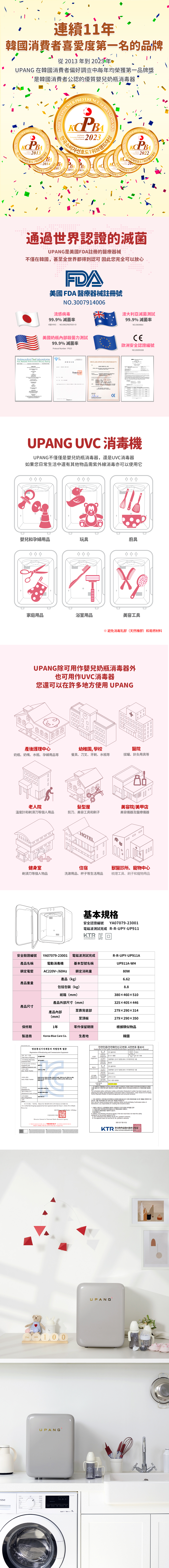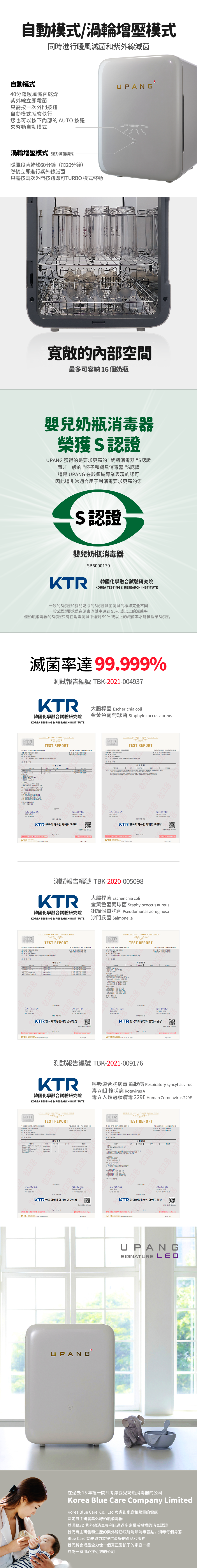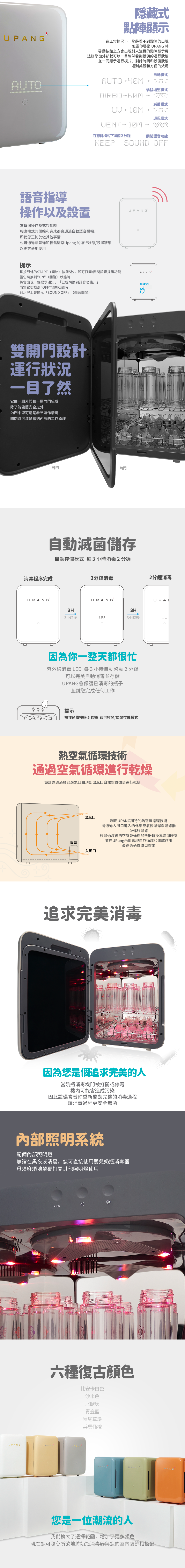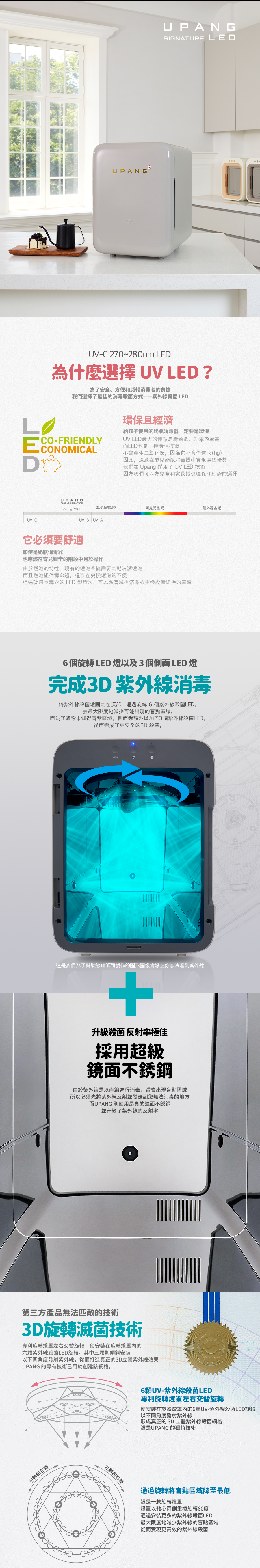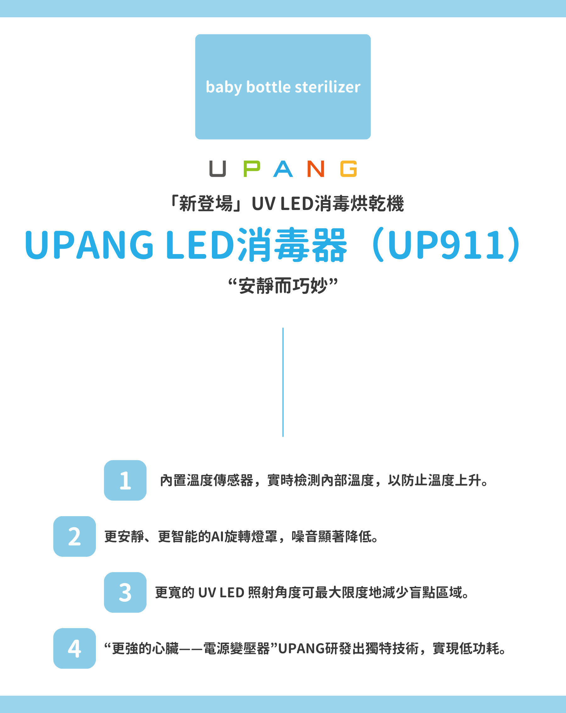 UPANG UP911 LED紫外線嬰兒奶瓶消毒器是一款經過FDA註冊的產品,經過可靠的健康組織測試以驗證其有效性。該消毒器配備了來自德國知名公司的可靠UV-C LED,可以在短短10分鐘內殺滅99.999%的有害細菌。通過旋轉式UV LED,它確保奶瓶的每個角落都得到徹底的消毒。此外,它還擁有隱藏的點陣顯示屏和高品質的超級鏡面不銹鋼,外觀時尚典雅。雙門設計還可以輕鬆監控消毒過程。