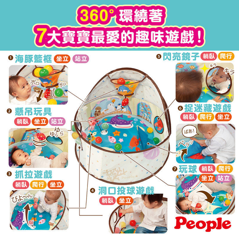 水族館遊戲帳幕多達20種以上不同玩法,寶寶最愛的空間,360度全方位環繞「海洋動物圖案」主題的遊戲池,充分滿足寶寶的「好奇心」。遊戲超多元性,讓寶寶玩的期間更長久,是一項結合腦力及體力的玩具組合喔! 適用6個月起~5歲,配合躺臥、爬行、坐立、站立不同成長階段