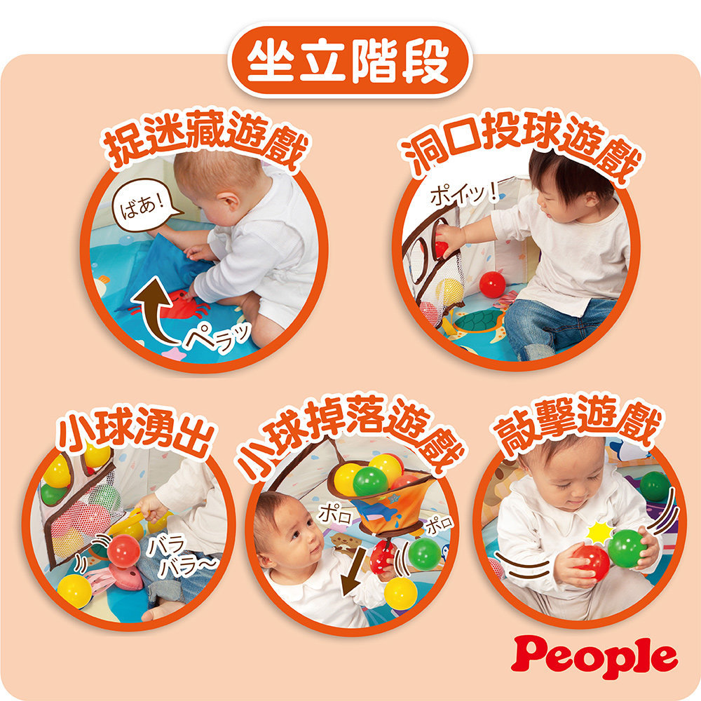 ●坐立階段:捉迷藏遊戲、洞口投球遊戲、小球湧出、小球掉落遊戲、敲擊遊戲
