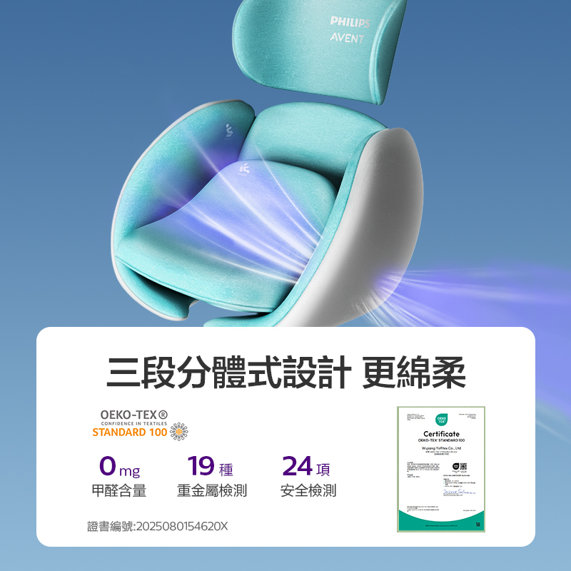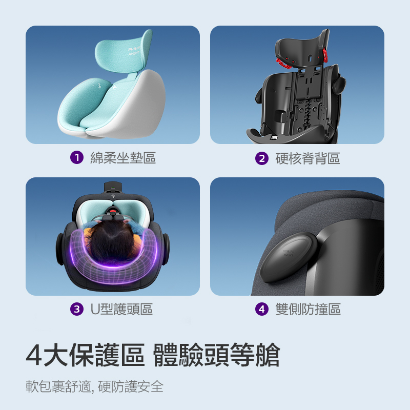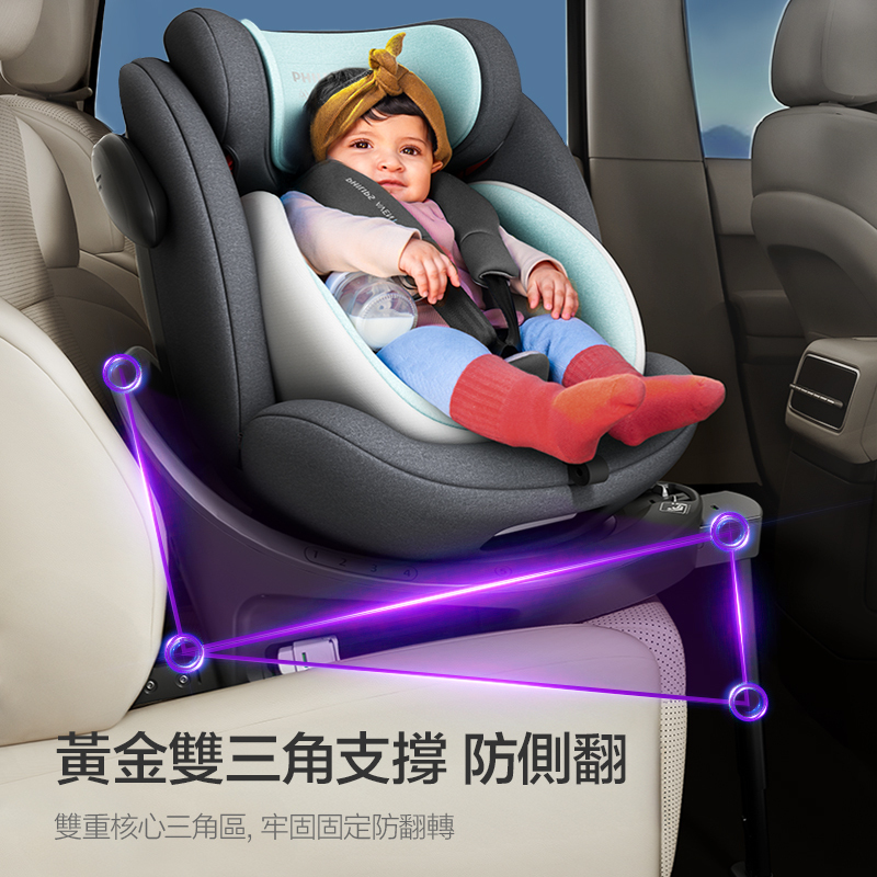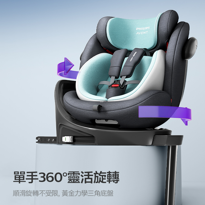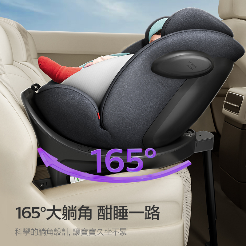 適用身高40-150cm,最大承重36kg,支援雙向安裝與雙向旋轉,方便隨需切換,並具14段頭枕調節和多重貼心設計。座椅正向傾斜106°、反向最高可達165°,搭配多檔位調節腰部支撐、安全帶長度、躺椅角度等,滿足成長中不同階段需求。