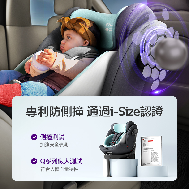 安全結構包含混合骨架、靜態側撞保護及抗翻轉設計,座椅填充及頭枕為EPE發泡材質,有座椅使用輔助提示,還附ISOFIX固定介面,安裝穩固安心。外殼採射出成型工藝,整體尺寸為55×42×60cm,淨重12.4kg,通過I-size及ECE多項安全認證及GB6675防火標準。