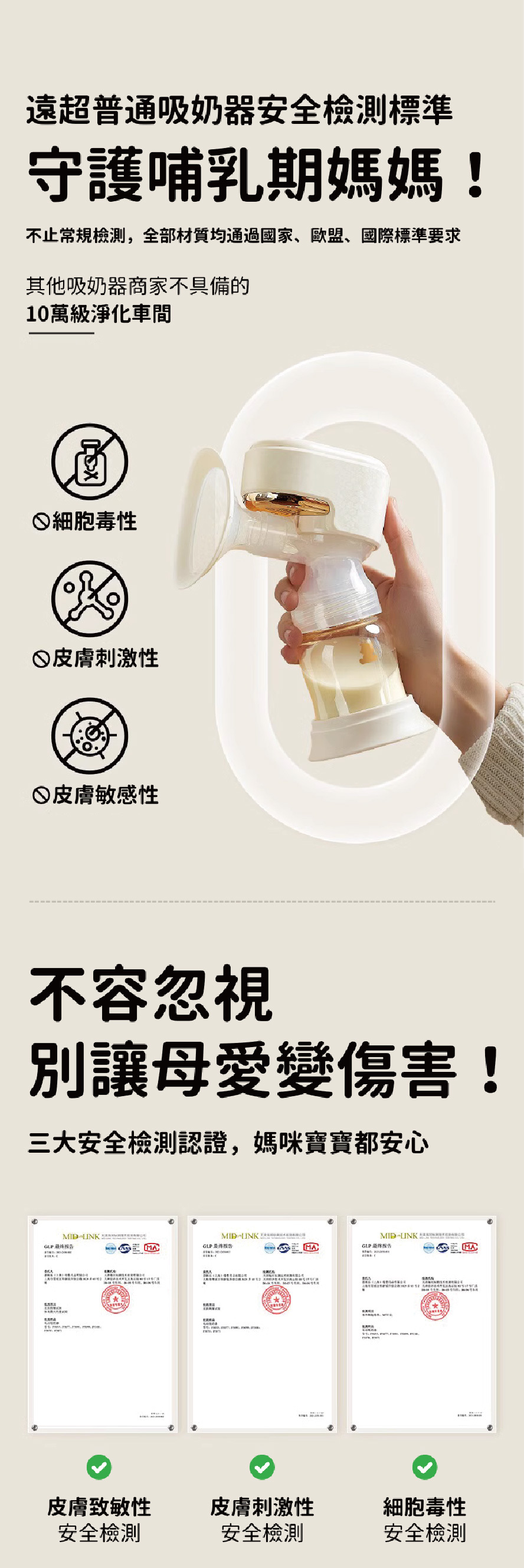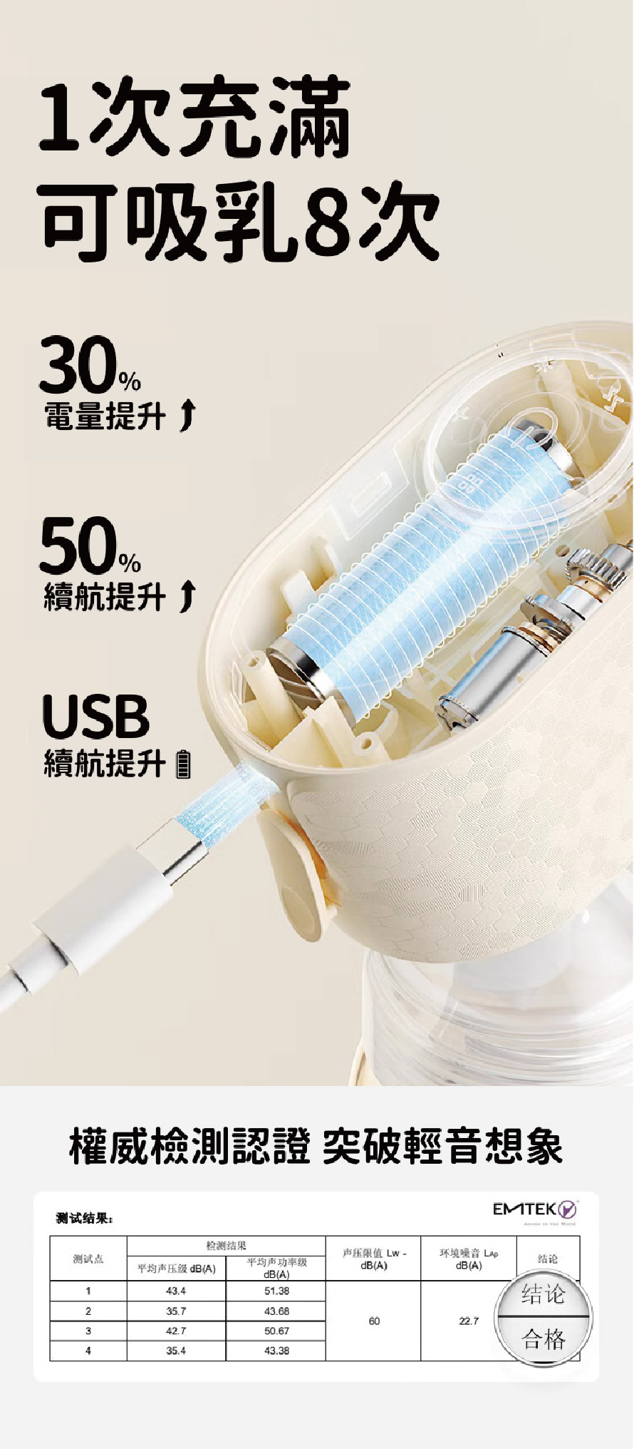 採用無縫設計 電池容量為1800mAh 一次充滿電約可進行8次泵奶 靜音操作,聲響只約39dB