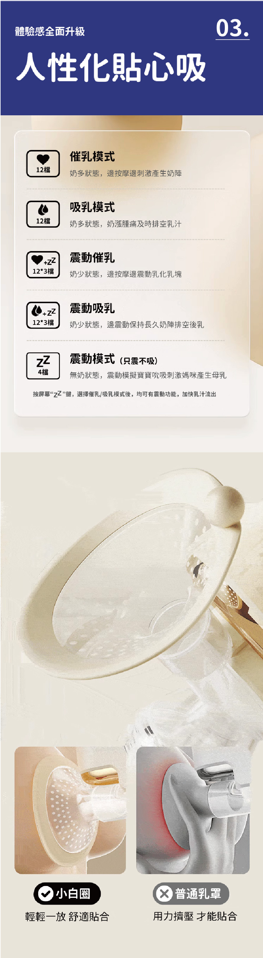 備有按摩模式,在泵奶前先讓乳房做足最佳準備,疼痛感減到最低,更放鬆。