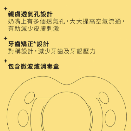 • 奶嘴上的氣孔,能提高空氣在奶嘴及寶寶嬌嫩肌膚之間的流通