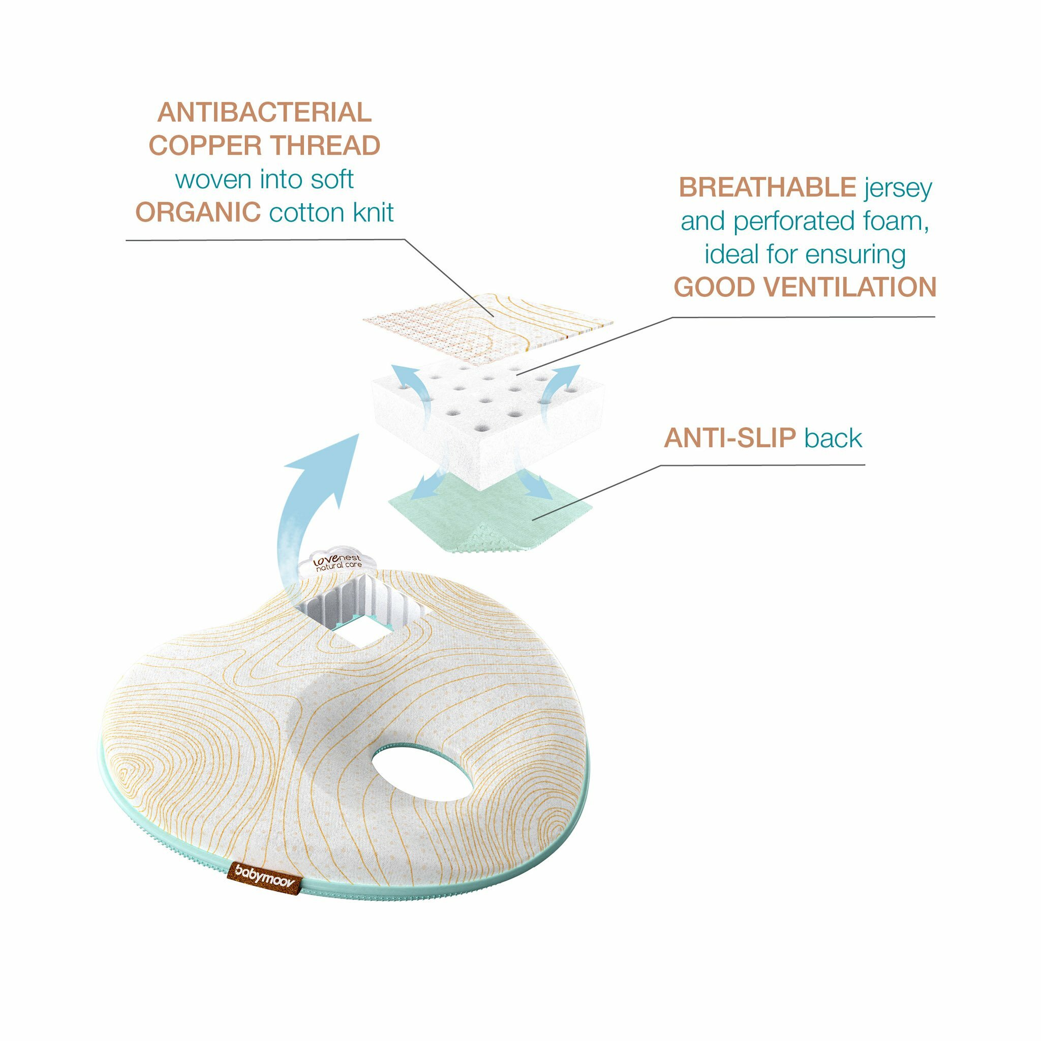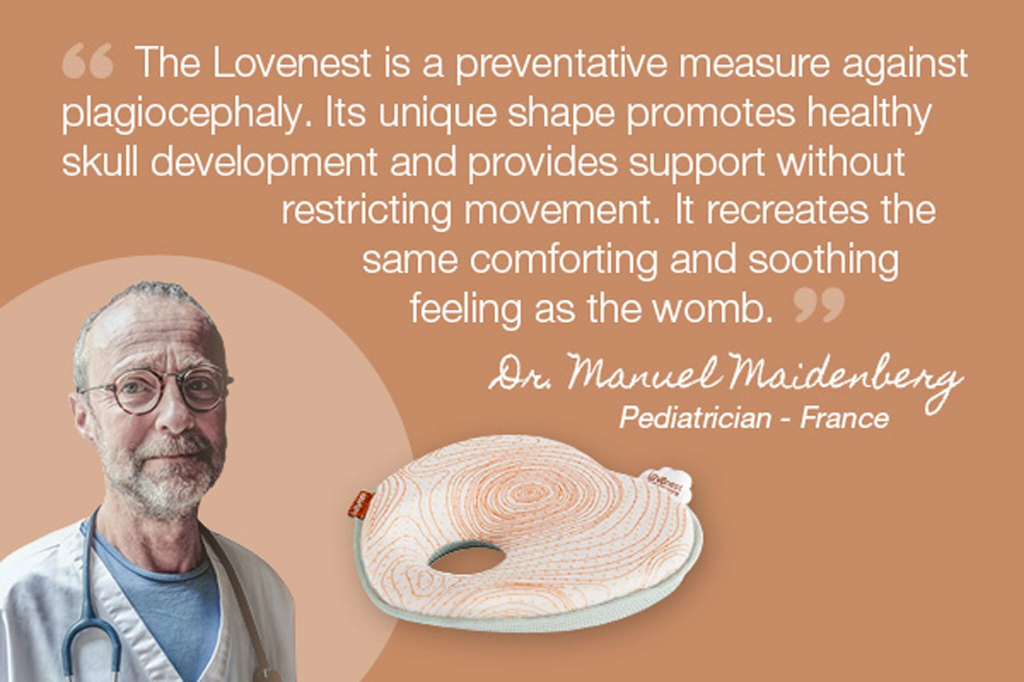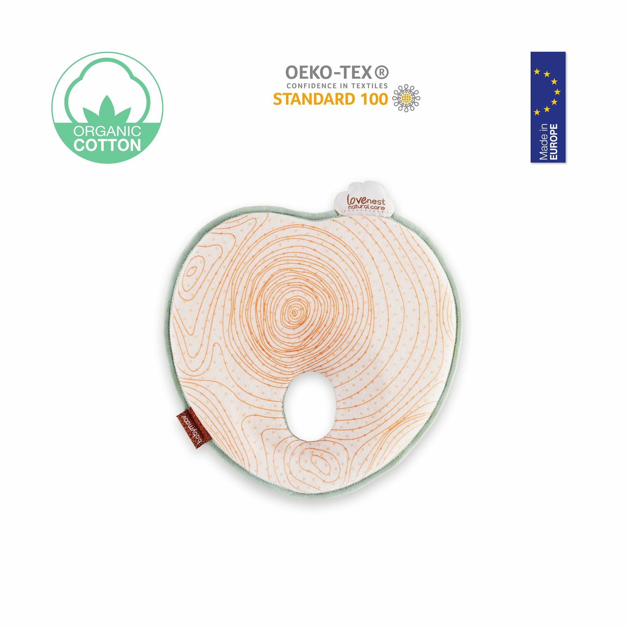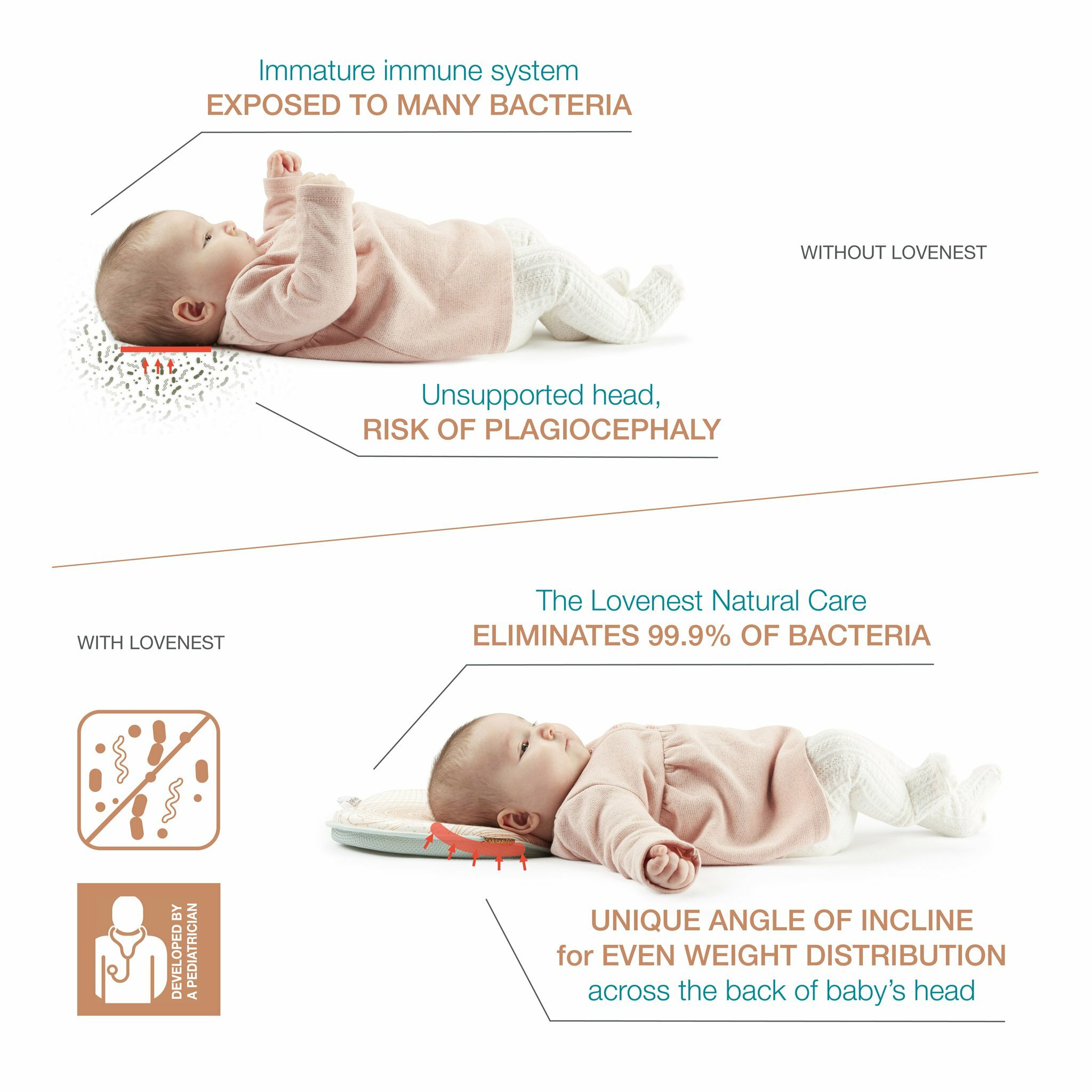 第一個抗菌有機棉的預防扁頭症的頭枕。Lovenest Natural Care 幫助"圓"美頭形發展!此頭部固定枕是由一位法國兒科醫生創造及獲得專利權,預防扁頭症。配合幼兒頭骨形狀而設計的傾斜角,讓頭部可被充分的支撐住,亦不會影響頭部轉動。在寶寶出生的第一個月,他們的大部份時間都是躺著的。寶寶在遊戲墊、嬰兒床、推車或甚至於搖椅上都可使用Lovenest 頭枕,來降低扁頭症的形成。Lovenest Natural Care於葡萄牙製造,專為免疫系統較弱的新生兒設計。