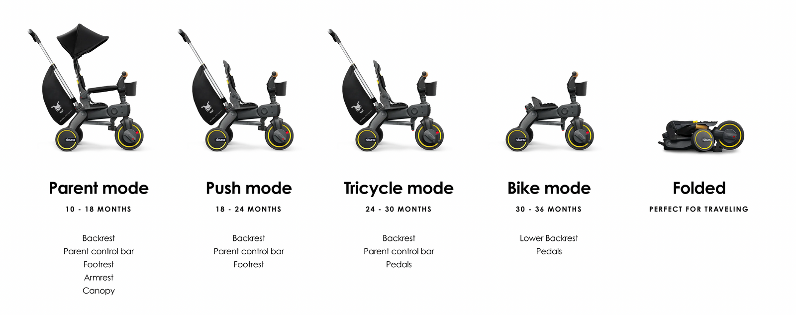第三階段(三輪車模式): 24-30 個月 – 多位置傾斜靠背、家長控制桿、腳踏板。