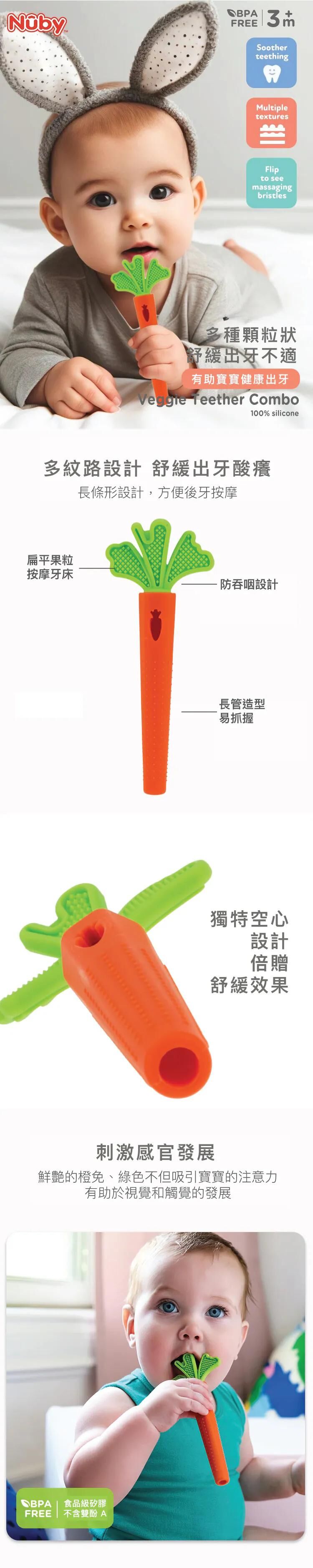 Nuby 蘿蔔牙齦按摩牙膠能幫助舒緩寶寶的長牙不適。多紋理表面設計能促進觸覺探索,並在寶寶長牙時按摩和刺激痠痛的牙齦。這款蘿蔔管狀牙膠採用柔軟有彈性的矽膠材質,能為煩躁的寶寶提供恰到好處的舒緩。管狀設計有助於緩解臼齒萌出的不適,尺寸大小也便於寶寶小手抓握。為讓父母安心,Nuby 蘿蔔牙齦按摩牙膠採用100%超柔軟矽膠製成。