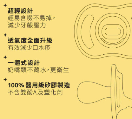 最輕的一體式矽膠安撫奶嘴*: 比我們原本的Ultralight安撫奶嘴輕20%,