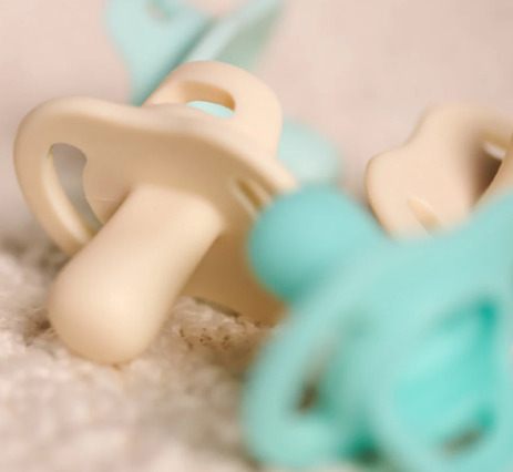 **矽膠奶嘴,奶嘴防護罩以及內部PP骨架共同粘合,形成一個一體式安撫奶嘴。